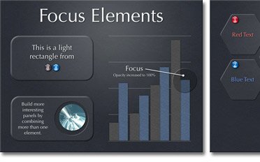 Focus Elements work well with any theme, although the best effects are achieved with simple backgrounds. 130 individual transparent or translucent graphics that will separate content, or bring focus, in a beautiful and subtle way. Plus 744 label beads (zero to nine, A to Z, in three sizes and six colors).