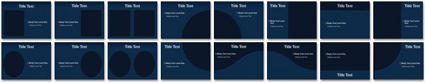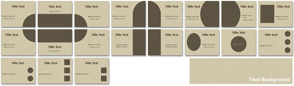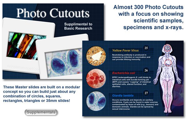 This theme is the foundation for a series of upcoming supplemental products specifically designed for the medical, health, dental, science and architectural fields. That said, it is a simple grid pattern and would suit many applications. The most compelling feature of this theme is the ability to customize it with the supplemental Photo Cutout Masters (see below). Many of the Masters are made from a series of quarter screen panels that the user can assemble in any combination to create unlimited variability. These supplemental files have nearly 300 Master Slides featuring circles, squares, triangles and 35mm slide frames. In addition, you can invisibly cover any photo cutout with the appropriate "PowerFill" and you have the ability to make hundreds of additional layouts.