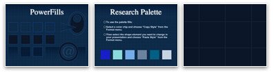 Another of the PowerFills is graduated and made for slipping behind text blocks or charts to really help bring professional design into the user's hands. Charts and tables are sized correctly for each master. The theme comes with 16 basic photo cutouts with many that align with the next for that spectacular effect with the Cube and Push transitions. Tiled left and right edges give seamless Push transitions. Clean chart colors all in the blue spectrum, a simple bullet design, theme palette and one complimentary background are included.
